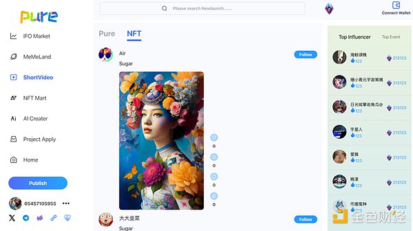 Pure不仅提供短视频、AI创作和动态信息流功能,还加入了Friendtech和NFT功能。那么NFT如何融入信息流?其关键在于通过API服务商调取NFT元数据进行展示。如果内容可以转化为NFT资产,并且具备未来现金流价值的可视化和量化能力,那么这种激励模式便可行。
