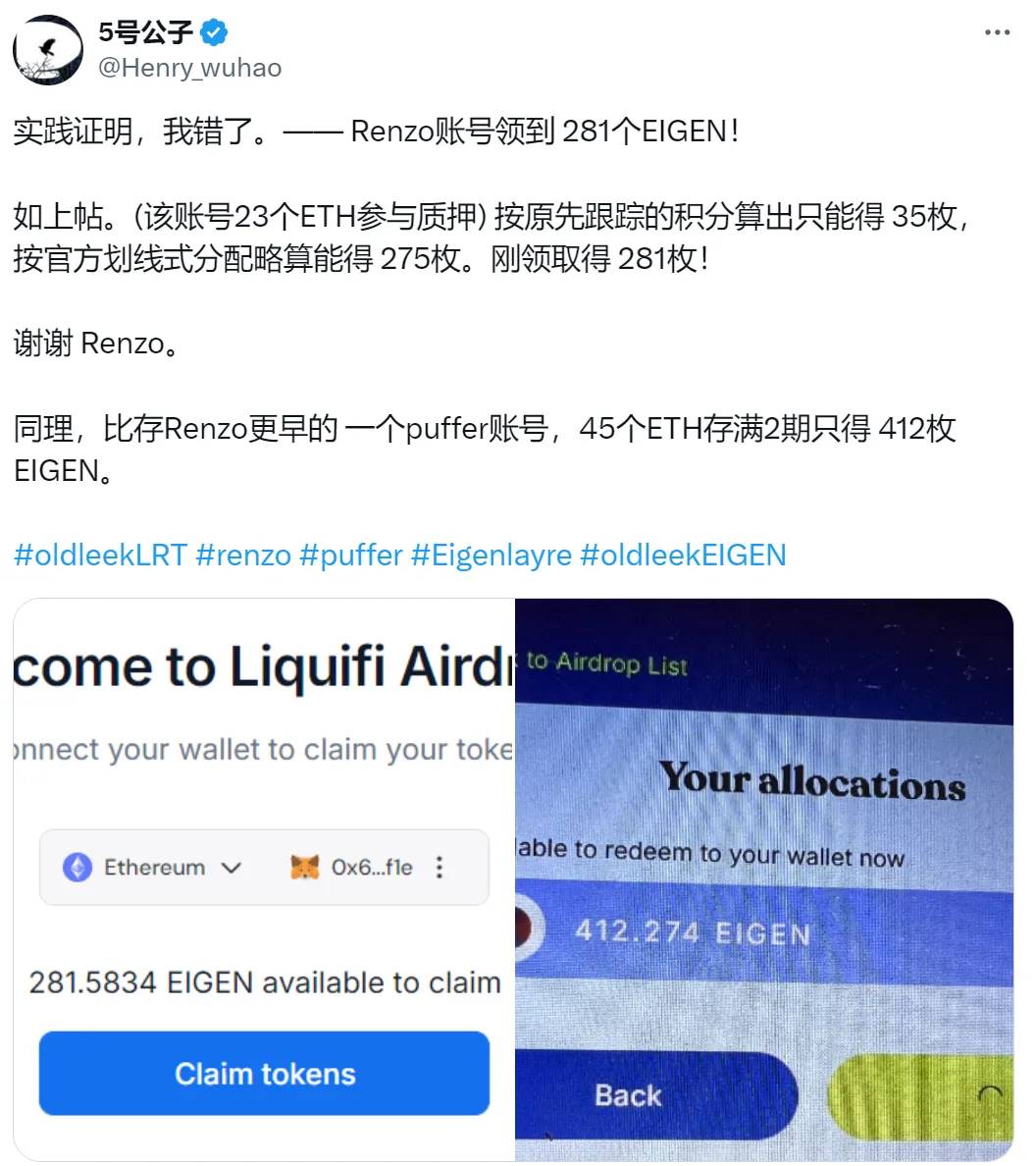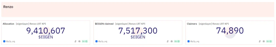 EigenLayer最近这期的奖励,是由Renzo率先(甚至是独家)公布了分配数据并执行了分发。