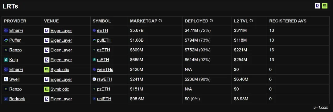 从上图第三方的数据我们可以看到,在EigenLayer众多协议中Swell、Renzo、Kelp以高复押率的优势遥遥领先,相较于Puffer(73%)和EtherFi(72%),总复押的TVL比例明显高出一大截,从而最大化了AVS奖励的收益。