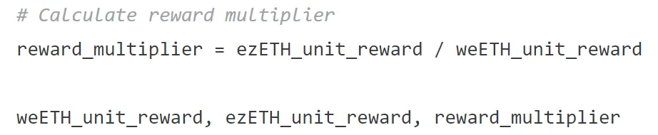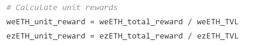 根据计算结果,每单位 weETH 的奖励为 1.33 EIGEN,而每单位 ezETH 的奖励为 1.93 EIGEN。因此,ezETH 用户的单位奖励是 weETH 用户的 1.45 倍。因此这套分配流程走下来,EtherFi 总奖励金额看起来很大,实际收益其实并不尽如人意。