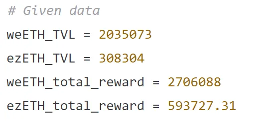 TVL 和再质押:根据EtherFi 最新发布的奖励分配推文,它首批再质押奖励分配中有 2,478,088 EIGEN,外加 500K ETHFI 可领取。ezETH 质押者获得了 593,727.31 EIGEN,而 weETH 质押者获得了 2,478,088 EIGEN,表面上看 weETH 质押者获得了 4.17 倍的奖励。然而结合TVL考虑单位收益,Let’s do the math.