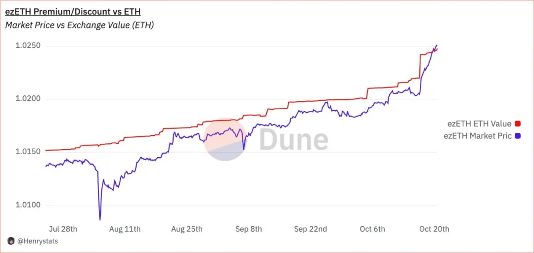 用户在2023年8月15日至10月8日期间,通过EigenLayer的复押奖励获得了超过200万美元的收益,这些奖励通过自动复利机制直接到达用户账户。与此同时,ezETH的价格从1.0224跃升至1.0242,目前以0.043%的溢价交易。总计超过200万美元的复押奖励被分发并持续滚动复利。这些奖励通过自动复利机制直接分配到用户账户,无需用户手动领取,极大提升了参与体验。