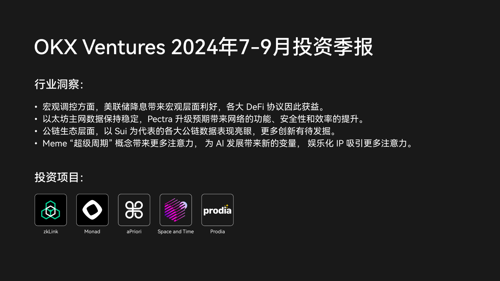 从Q3 的这些变化来看,OKX Ventures 对市场前景非常乐观,宏观上降息作为重大利好、以太坊持续创新、链上部分数据创新高、以SUI 为代表的公链生态和 Meme 带来的文化创新 ,均为行业提供持续的增长动力。本季度我们聚焦于具备战略潜力的项目,不仅契合市场增长机会,也在各自领域展现出独特的竞争优势。