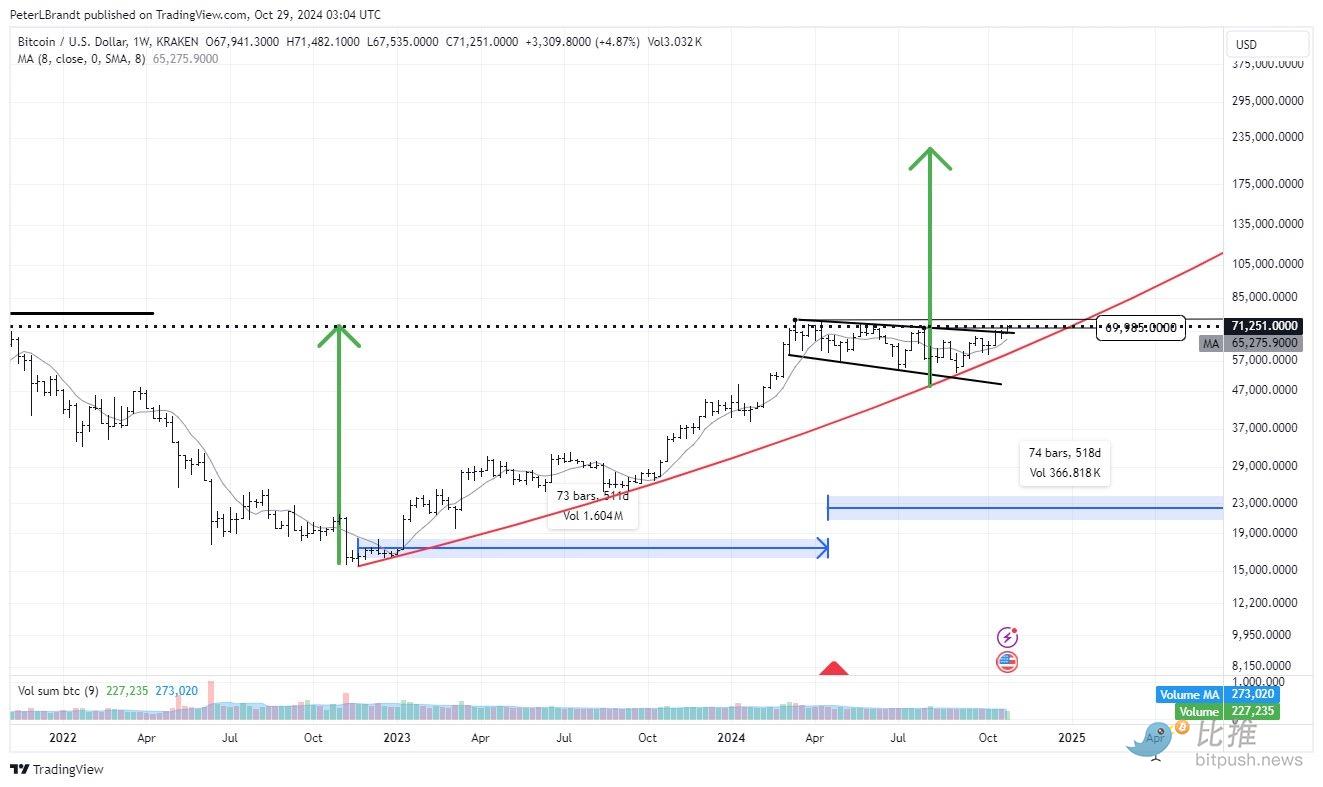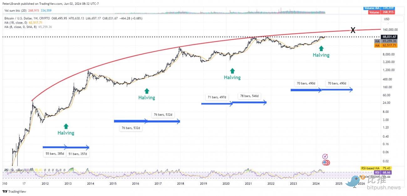 第二种情形下,Brandt 将 2022 年 11 月至 2024 年 3 月之间的价格波动幅度作为参考,并将其投影到未来的价格走势上。通过这种方法,Brandt 计算出了一个潜在的目标价位,超过了 20 万美元。他表示:「目前,我认为这有点夸大其词。我的原则是每次只瞄准一个目标。」