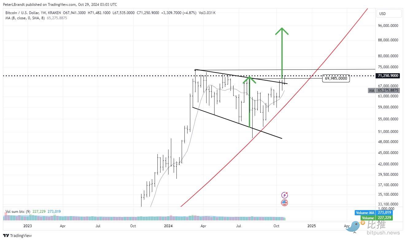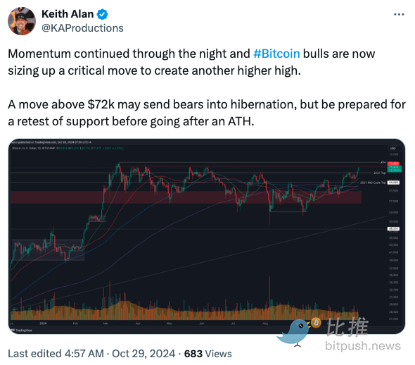 市场分析师 Keith Alan 预计,此次上涨将接近历史最高水平,随后可能出现回调,他表示,「突破 72,000 美元可能会让空头进入‘冬眠’,但在追逐历史最高水平之前,要做好重新测试支撑位的准备。」