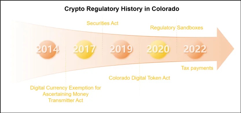 相比于科罗拉多的税收政策,其广泛的监管制度与开放创新的营业环境更能吸引加密货币企业。科罗拉多州对于加密货币的监管变化经历以下时段: