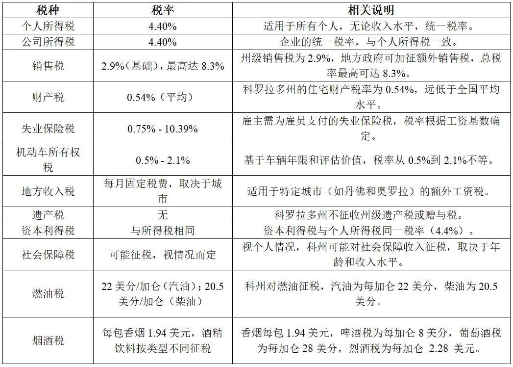 科罗拉多州官网上目前有 11 大类税种,如所得税、土地税、销售和使用税等。部分税种、税率汇总如下: