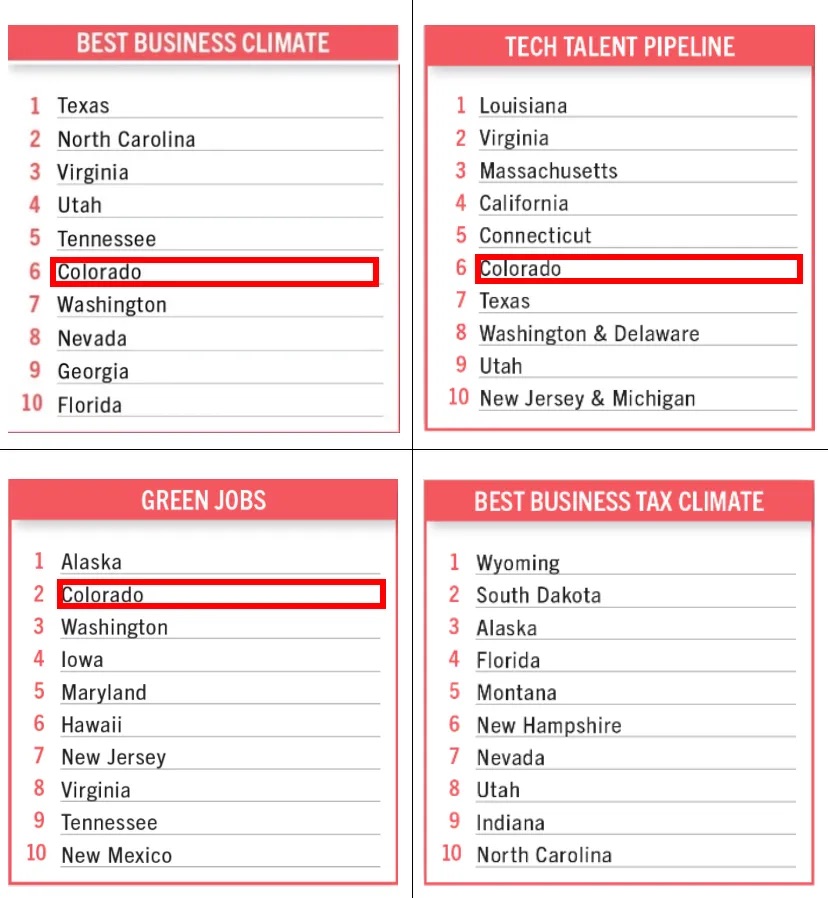 根据 Business Facility 2023 年关于商业选址的一份报告,科罗拉多州在「绿色工作」中排行第二,「最好商业环境」,「技术人才」等榜仅排行第六,此外如「最佳商业税务环境」,「专业劳动力培训」等甚至榜上无名。从整体税务环境来看,科罗拉多州似乎并没有像得克萨斯州那样的低税率,为什么该州对于注册货币服务企业(MSB)有如此吸引力呢?
