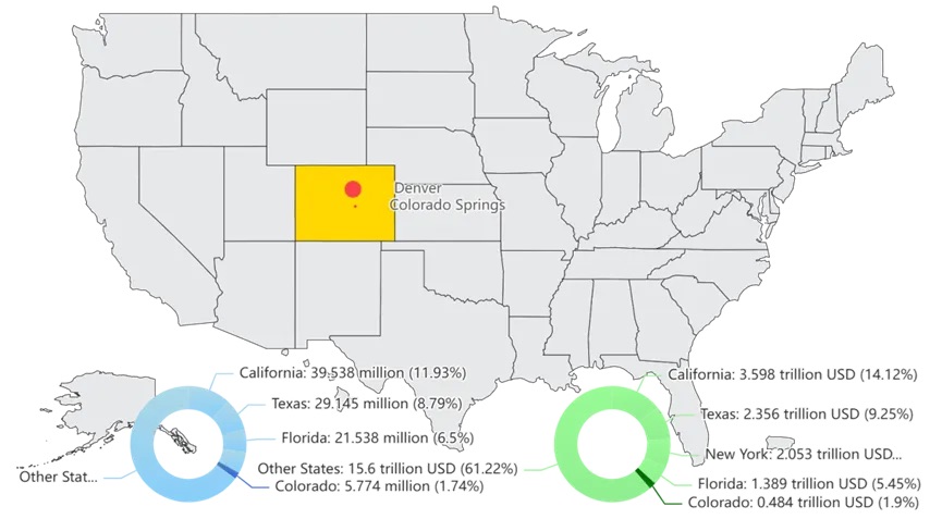科罗拉多州(Colorado),简称科州,位于美国西部,横跨落基山脉东部。其面积约 26.8 万平方公里,人口约 577 万(2020 年),在全美 50 个州中,面积排第 8,人口排第 21 位。该州首府为丹佛(Denver),也是该州最大城市。由于其丰富的自然资源和多元化的经济结构,科罗拉多州在美国版图中占有重要位置。
