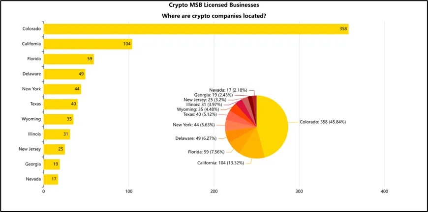 无论从面积、人口还是经济总量等指标来看,科罗拉多州都是美国的一个相对较小的州,但该州在加密货币活动中的地位却极为重要,根据美国金融犯罪执法网络(FinCEN)的数据,科罗拉多州注册加密货币企业约占全美注册加密货币企业的 33%。分析来看,这种现象主要得益于科罗拉多州积极的政策支持、宽松的监管环境以及在能源和产业方面的优势,其中关键人物的助力也不可或缺。接下来,我们将详细分析科罗拉多州在这些方面的具体表现及其如何推动该州成为加密货币行业的重要中心。