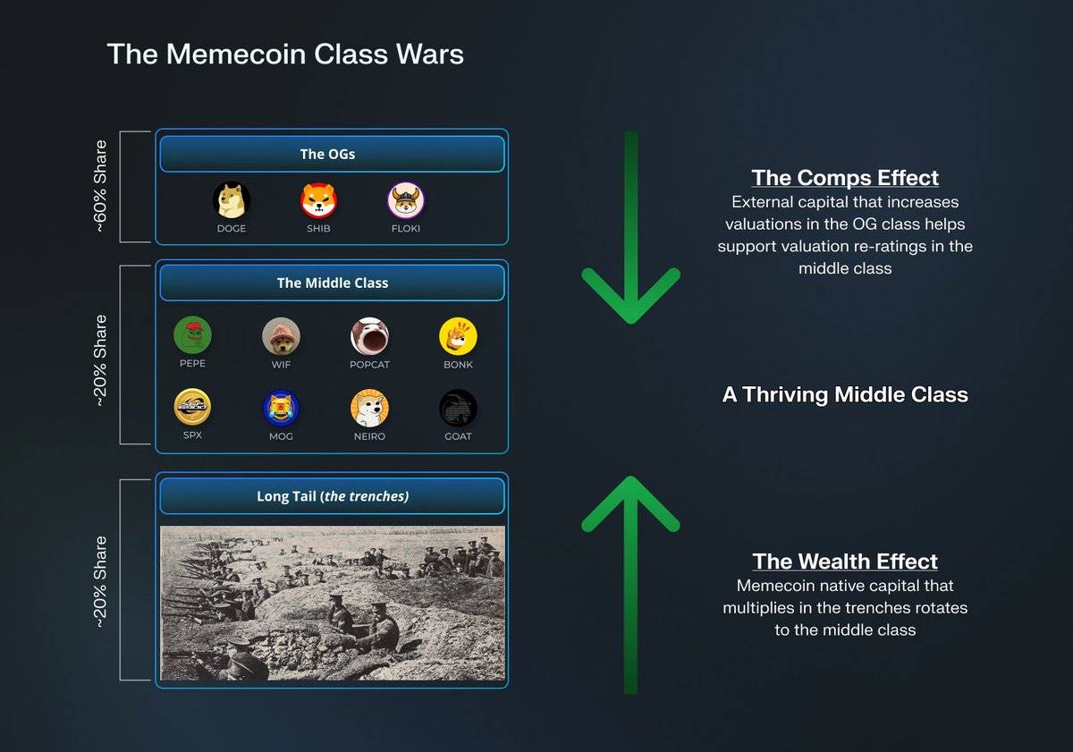 随着 Meme 币作为一个领域获得了更大的认可,中产阶级重新评级的理论也将吸引新的潜在买家。这些资产($PEPE、$WIF 等)相比于小市值币种更具流动性,波动性更低,并且更容易管理。