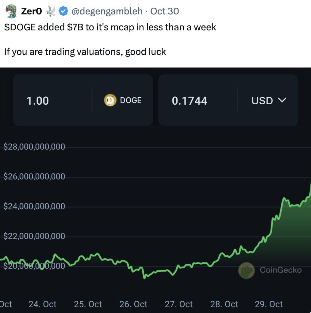 资金大部分可能来自其他加密领域。散户可能会有所帮助,因为我认为 $DOGE 在普通人心中的认知度甚至高于 $SOL,但现在的流动性环境与 2021 年相比有了显著变化。