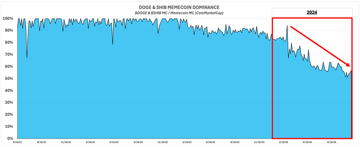 今年大部分的价值增长来自于非 $DOGE / $SHIB Meme 币的爆炸性增长。目前 DOGE 和 SHIB 的市场主导地位已降至约 57%: