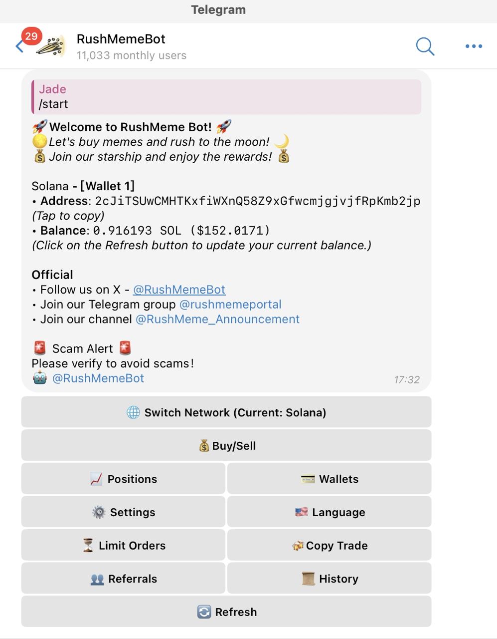 RushMeme Bot: Telegram 上多链一体的交易机器人,专为极速、安全 Memecoin 交易而设计,支持 SOL、ETH、BSC、BASE、SUI 等公链。复制合约即可快速交易,是市面上交易链路最短机器人。