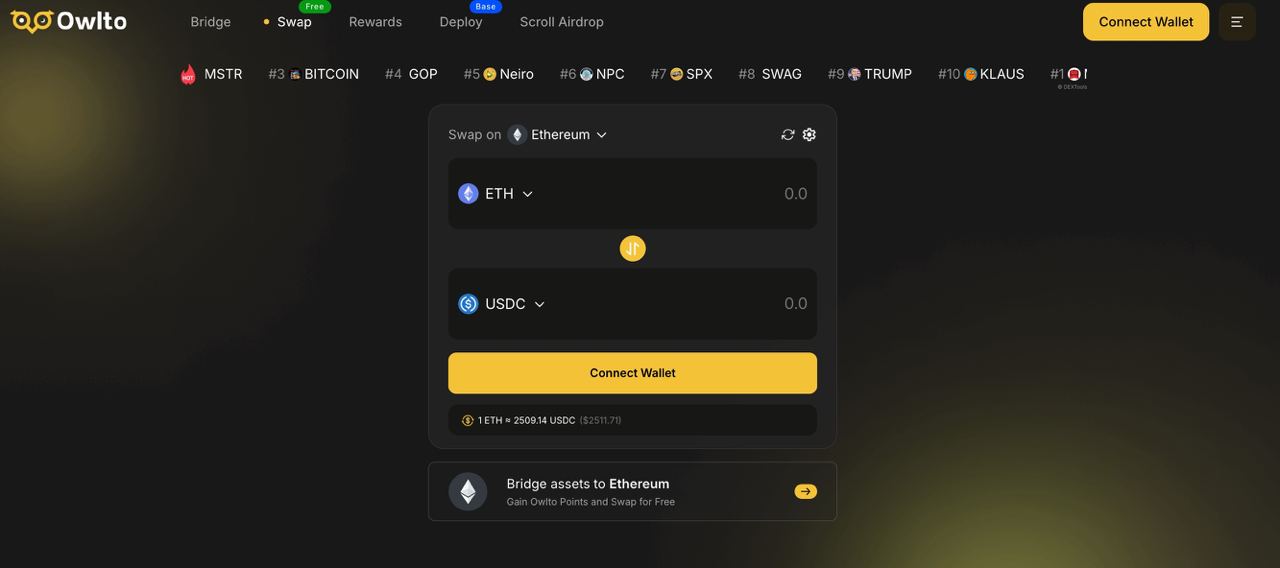Owlto(owlto.finance): 做跨链桥起家的多链兼容应用。现已支持大约 20 个主流链上的 Token Swap,且在大多链上都是零手续费,有价格优势;网页端还会显示当下最火的 10 个 Memecoin,为用户提供 alpha 机会。