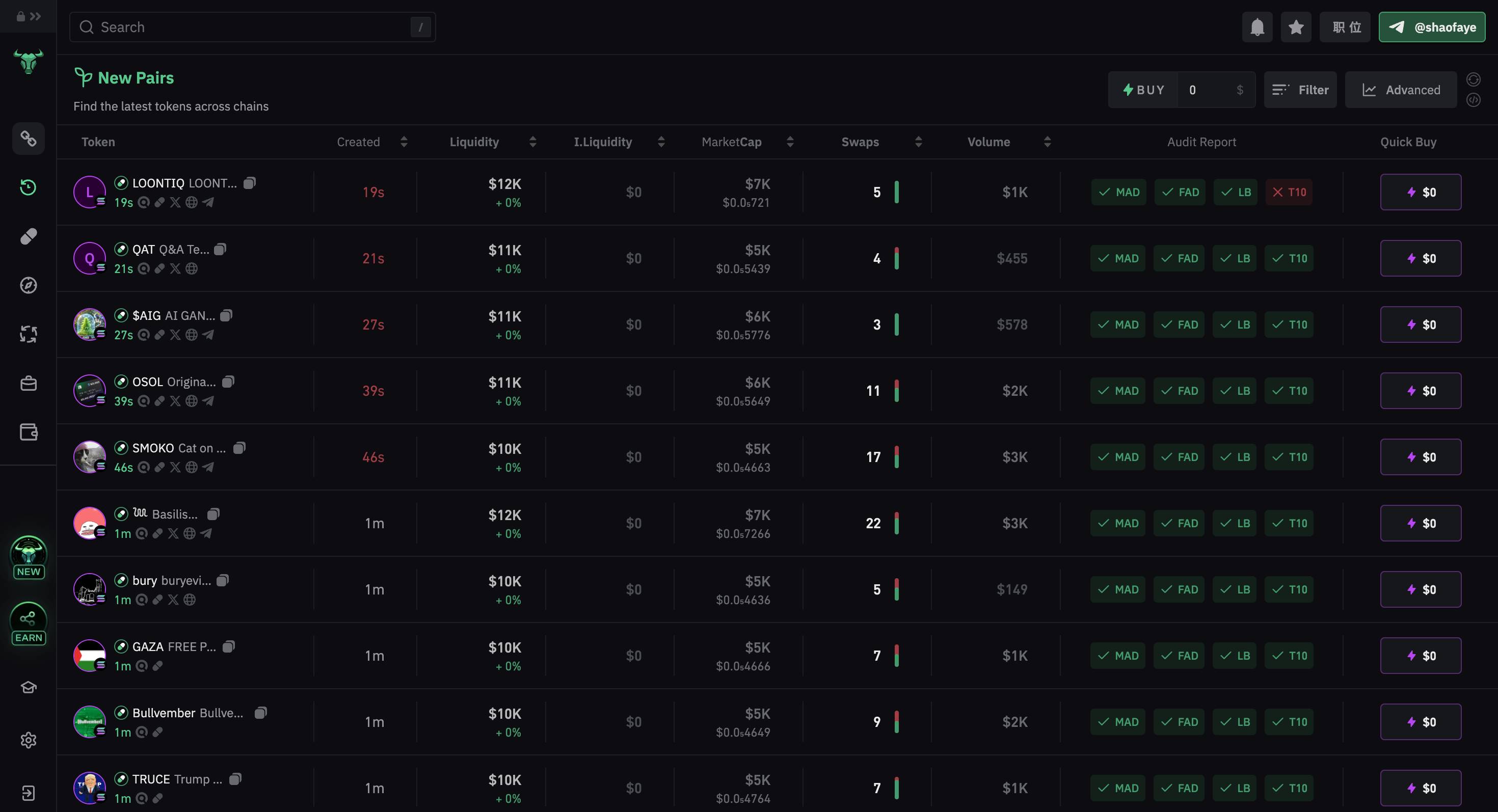 Bullx:专业交易工具,多平台支持(通过 Telegram 或网页界面访问)、多链兼容、并集成了 Pump.fun 以跟踪最新的 Meme 币趋势。每笔交易将收取 1% 的费用。