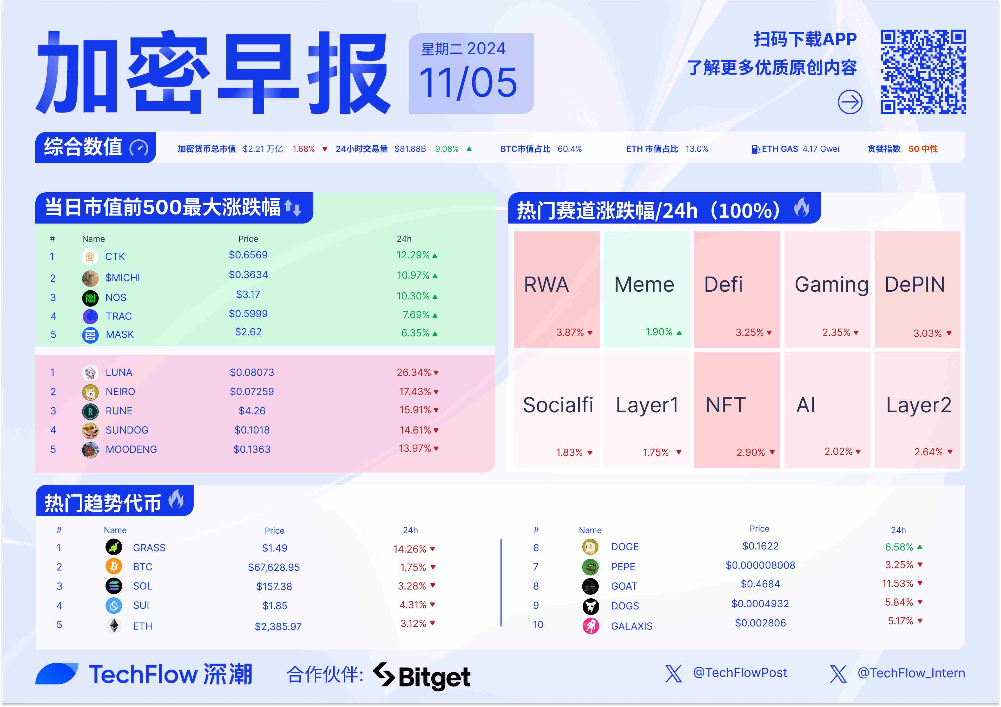 AI 导读:文章探讨了加密货币市场的近期趋势和未来展望,尤其是在美国大选前后的市场动态、比特币的潜在反弹以及新兴趋势如 Memes、AI、BRC-20 和 RWA。文章还分析了投资策略,建议关注那些经历过市场动荡的老牌 meme 币,并强调了机构对比特币的兴趣和资金流入趋势。