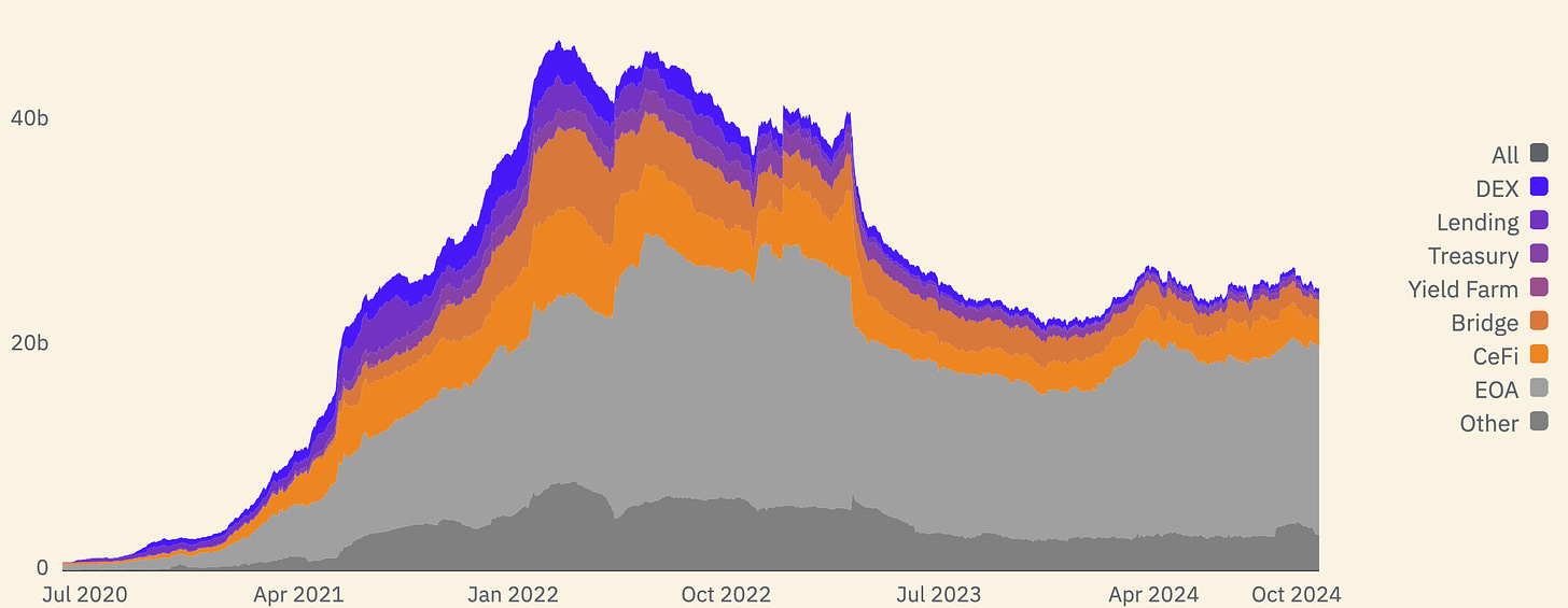相比之下,USDT 的分布更为集中,外部拥有账户 (EOAs) 中持有 815 亿美元,而中心化金融 (CeFi) 中持有 263 亿美元。桥接资产持有 51 亿美元,去中心化交易所 (DEXs) 持有 4.73 亿美元,借贷协议持有 4.39 亿美元。国库账户持有较少,仅为 5400 万美元,收益耕作仅为 100 万美元,其他持有总计 25 亿美元。