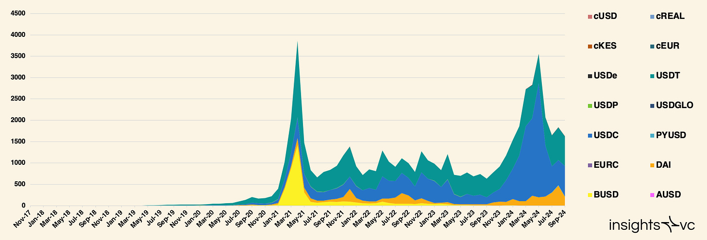 USDT 和 USDC 在稳定币市场中占据主导地位,是供应和交易量的主要组成部分。其他稳定币如 DAI、BUSD,以及新兴的 PYUSD,虽然份额较小但在不断增长,显示出市场的多样化趋势。