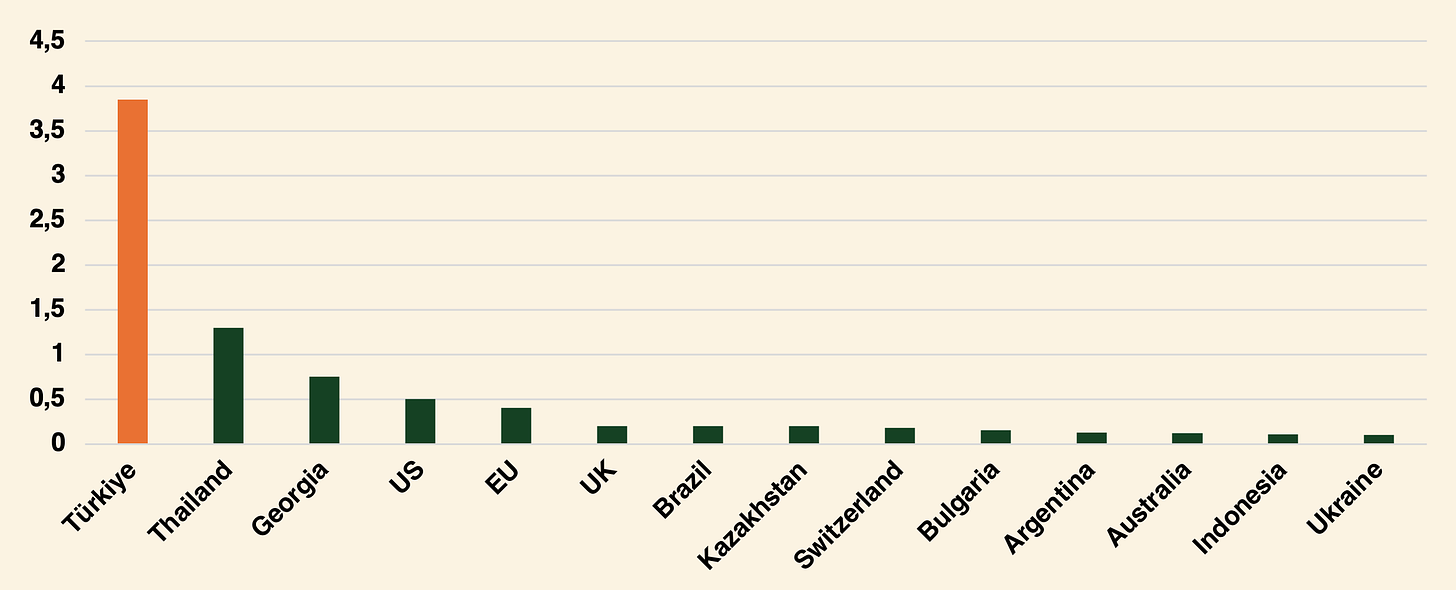 各国用法定货币购买稳定币占 GDP 的比例 (2023 年 7 月 - 2024 年 6 月)
