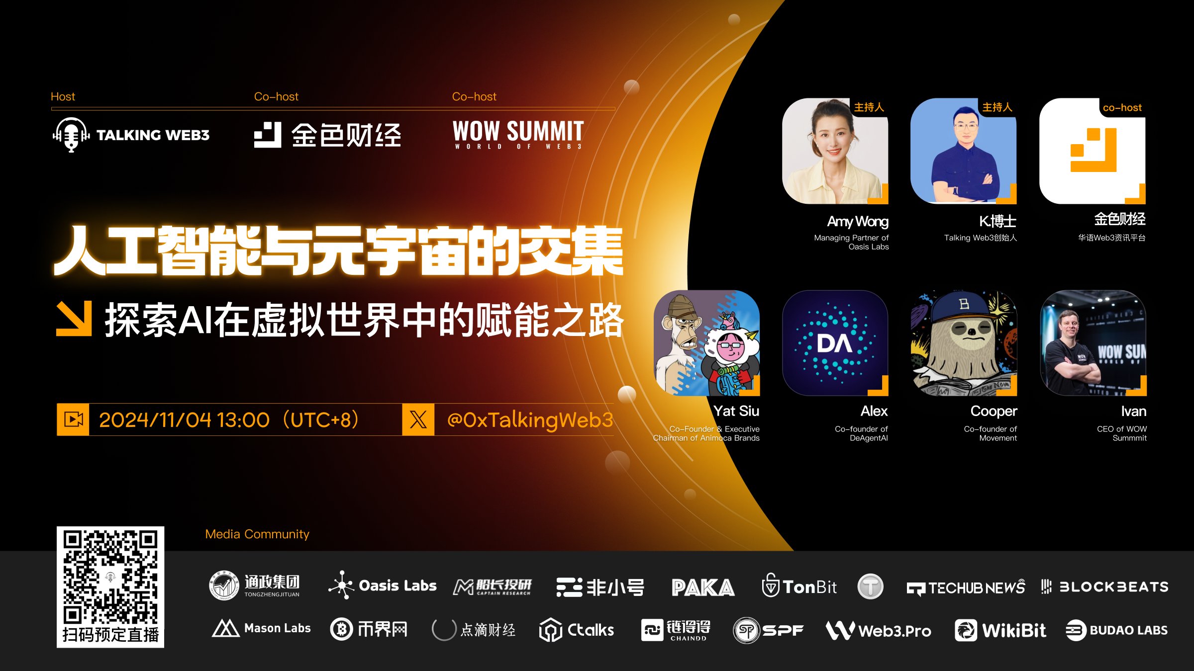 11月4日,由Talking Web3携手金色财经和WOW Summit共同举办的2024 WOW Summit曼谷峰会专场Space第三期成功举行。本期活动主题为“人工智能与元宇宙的交集:探索AI在虚拟世界中的赋能之路”,吸引了Animoca Brands联合创始人Yat Siu、DeAgentAI联合创始人Alex、Movement联合创始人Cooper以及WOW Summit CEO Ivan等行业大咖,深入探讨了人工智能如何在元宇宙中实现多样化应用,推动虚拟世界的创新发展。