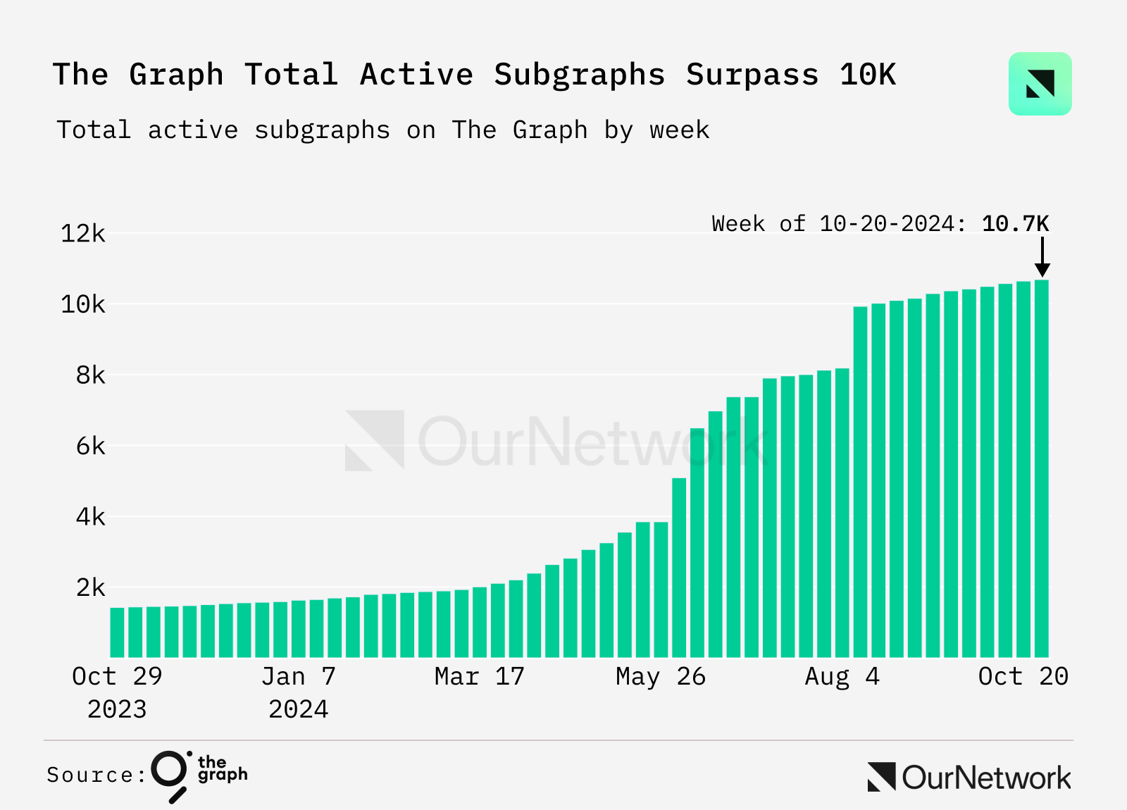 The Graph 的活跃子图数量持续增加,截至 2024 年 8 月已超过 10,000 个。截至 10 月 26 日,这一数字已增至超过 10,680 个。这一稳定增长表明 The Graph 在大规模支持去中心化应用中的作用日益重要。
