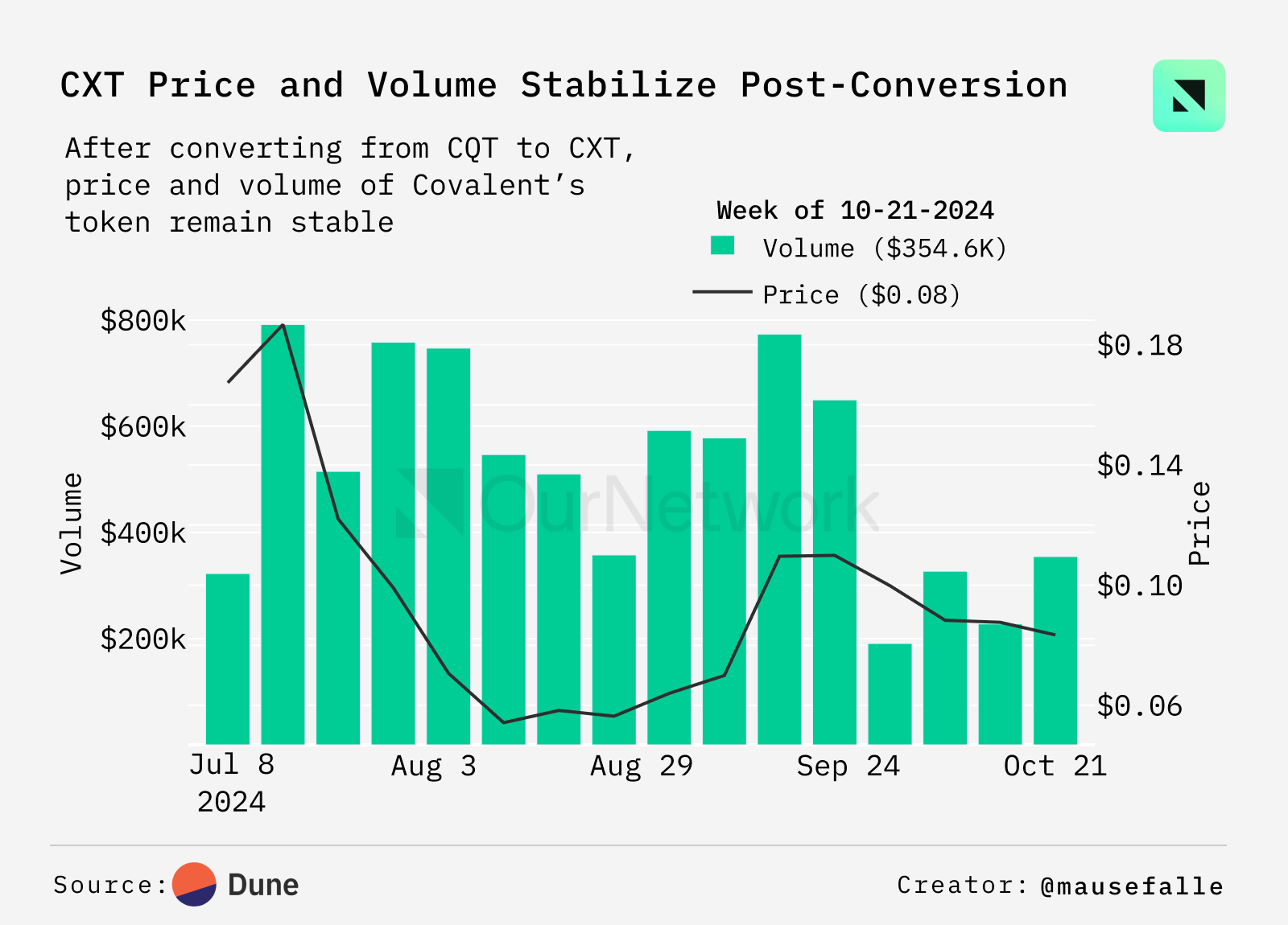 Covalent 在今年 7 月将其主要代币 CQT 更名为 CXT。自那时以来,CXT 的价格保持稳定,波动在 $0.1 到 $0.07 之间。去中心化交易所 (DEX) 的交易量基本上与价格趋势一致,9 月底之前在 $500k 到 $700k 之间浮动,此后约为 $300k。