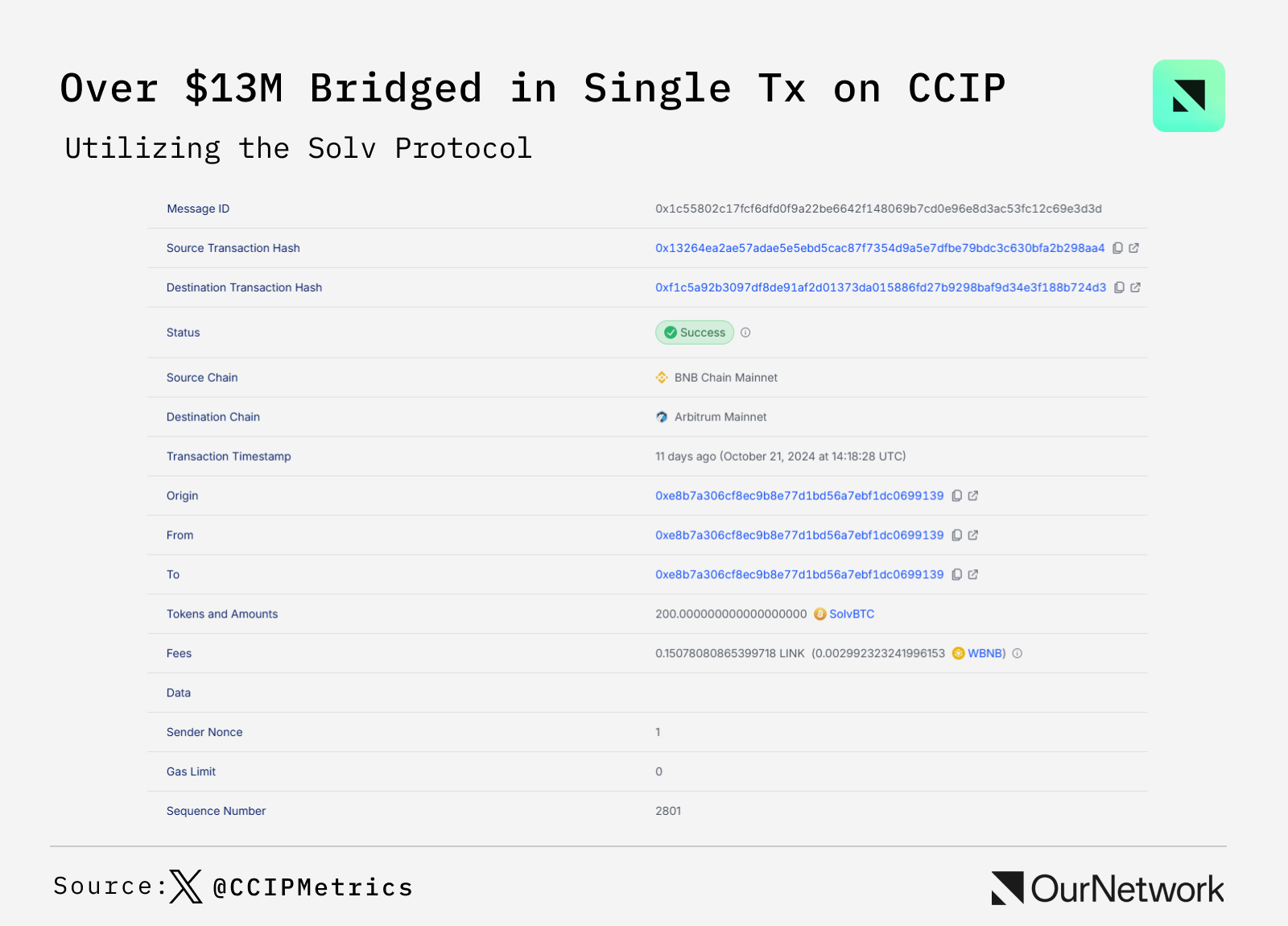 其中一笔交易通过 Solv Protocol 使用 CCIP 桥接了 1,300 万美元,Solv Protocol 是领先的比特币质押平台。用户继续通过 CCIP 进行高价值的跨链交易,这些交易在 CCIP Explorer 上可见,其中这笔交易的规模尤其引人注目。