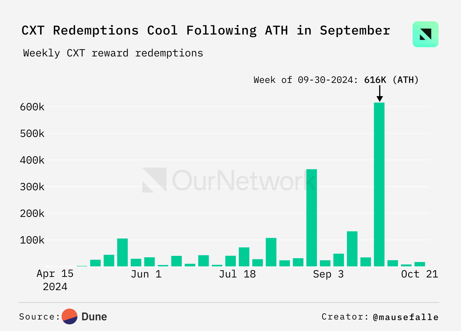 目前有 2.74 亿 CXT 被质押,占流通供应量的 32%。奖励赎回在 9 月的最后一周达到了历史新高,超过 60 万枚,大约是 8 月最后一周创下的历史高点的两倍。委托的 CXT 数量已达到允许上限的 99.7%。