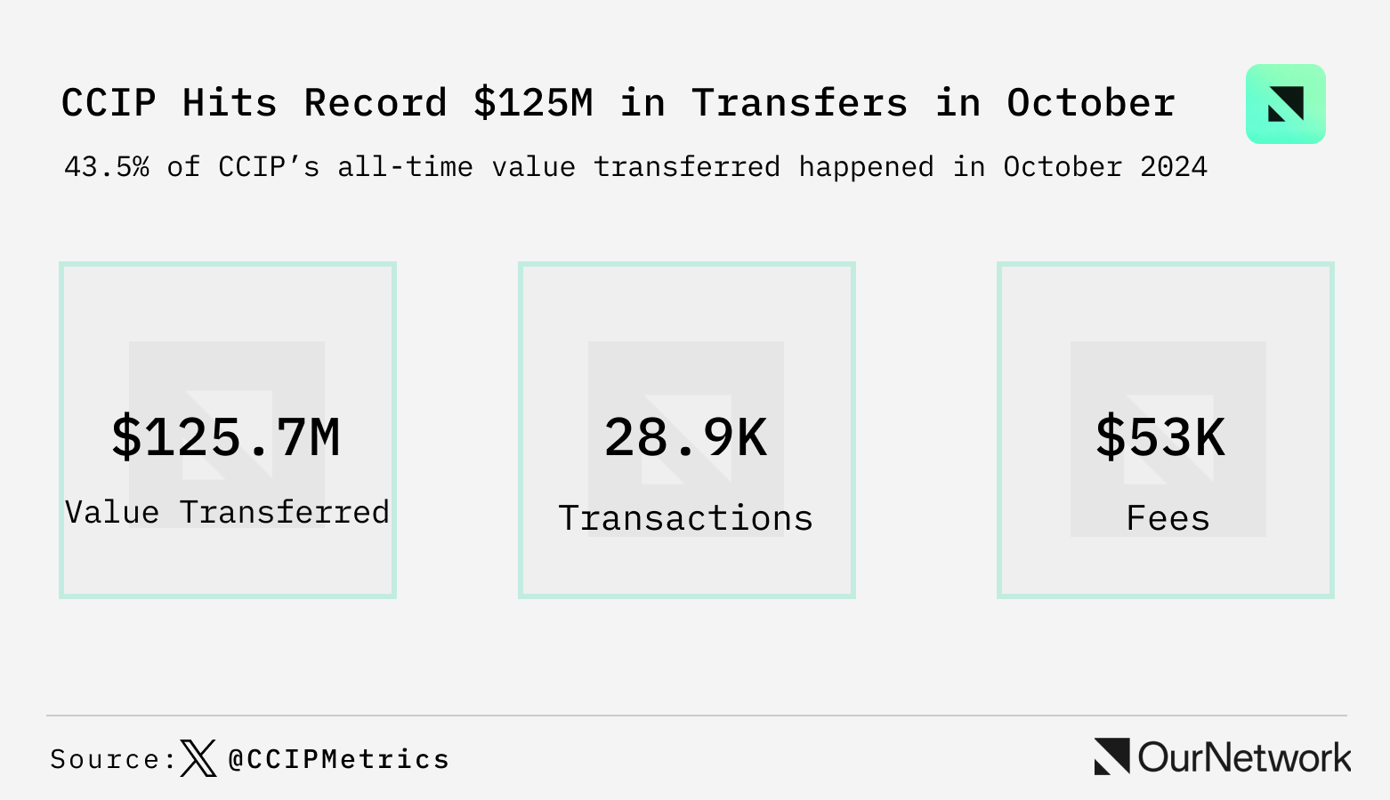 10 月份对 CCIP 来说是创纪录的一个月,用户通过该协议在区块链之间转移了价值 1.257 亿美元,占 CCIP 历史总转移价值的 43% 以上。