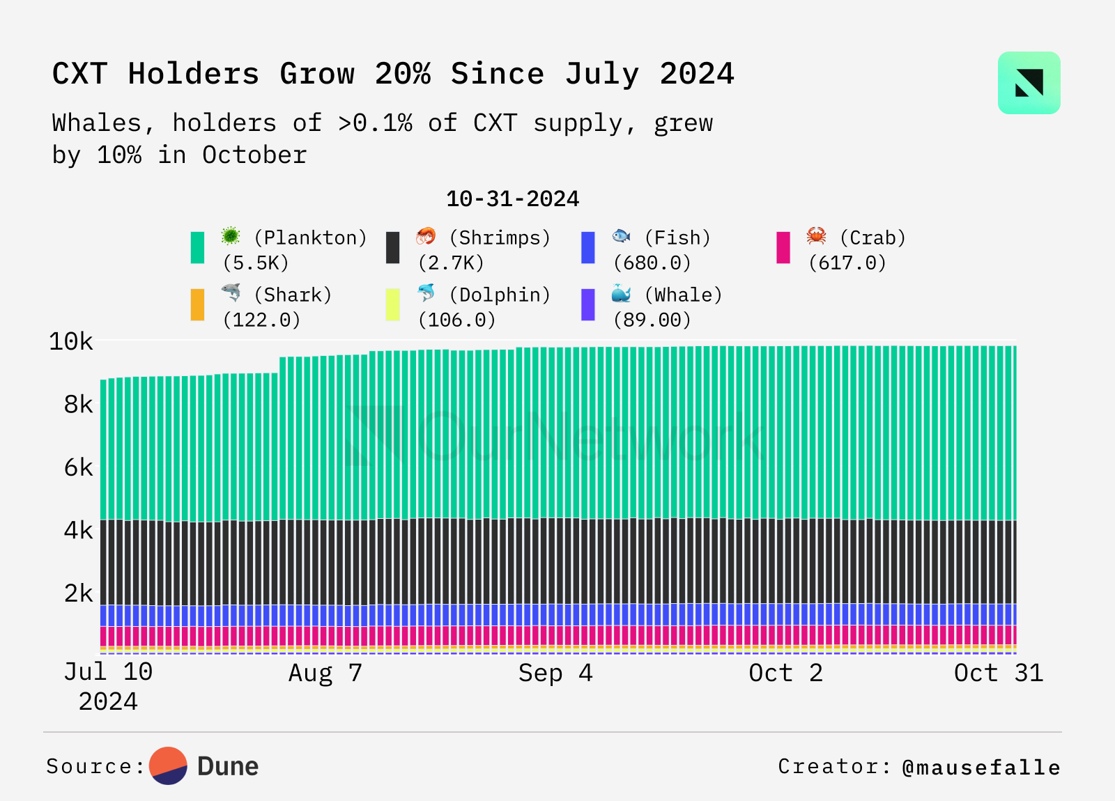 自 7 月以来,CXT 的总持有者数量增加了 20%,达到约 10,000 人。其中,最小持有者类别(即持有少于 0.0001% 总供应量的持有者)合计持有 55% 的供应量。有趣的是,持有超过 0.1% 总供应量的巨鲸数量在 10 月增长了 10%。
