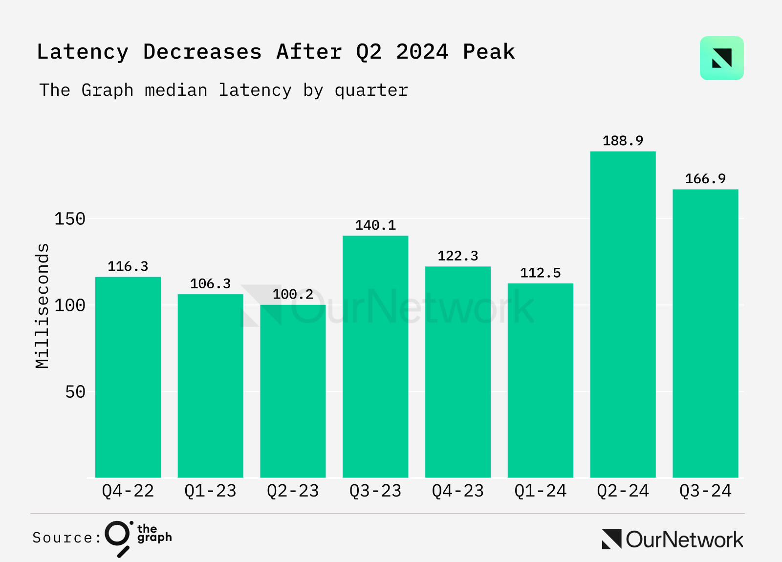虽然在 2024 年第二季度,由于需求增加导致了查询量的暂时高峰,但 The Graph 迅速优化了性能,将第三季度的中位数延迟降低到 166.9 毫秒。这体现了他们对性能的承诺,以及在使用量增加的情况下,提供快速访问 Web3 数据的可靠网络基础设施。