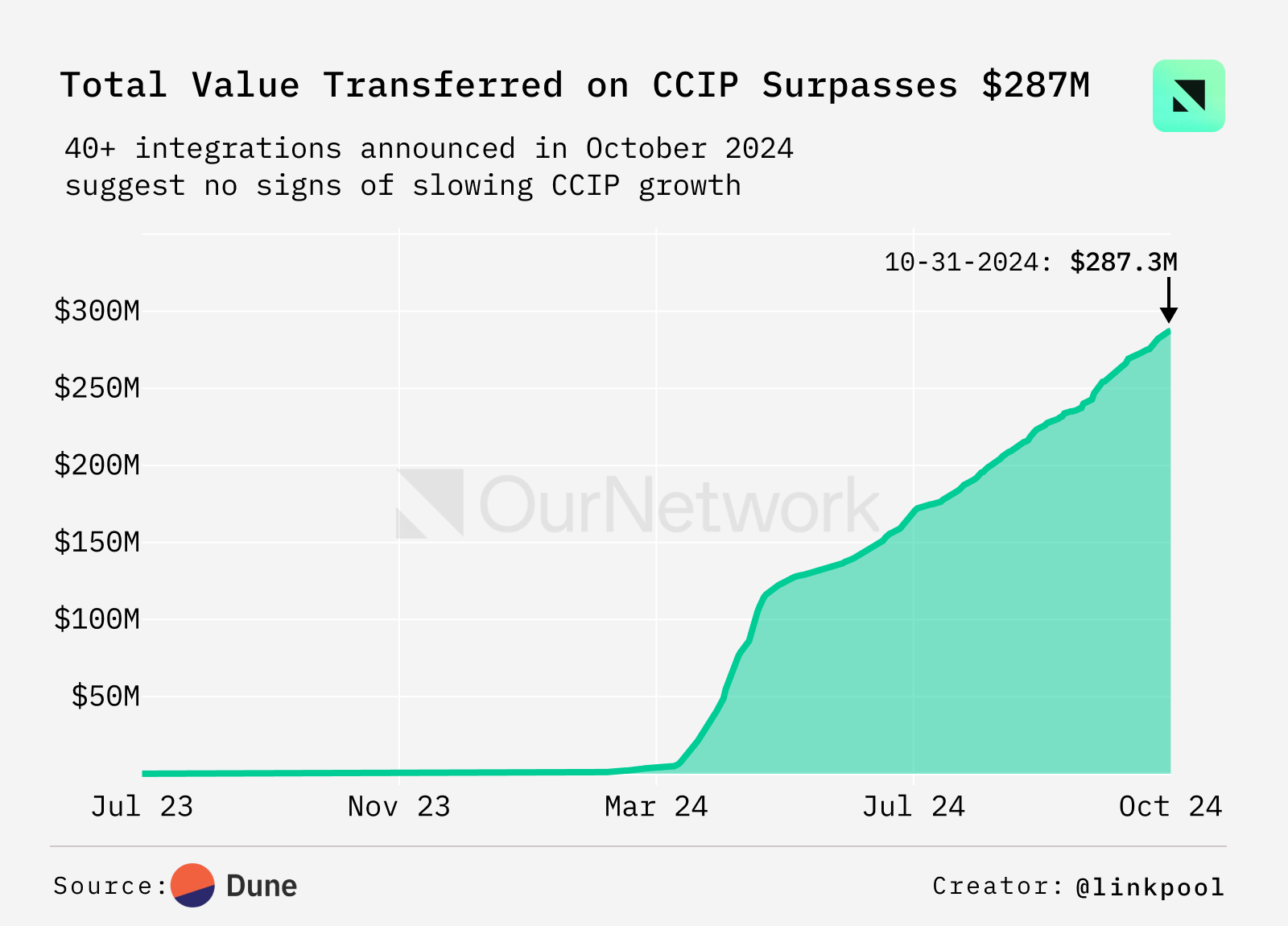 Chainlink 的跨链互操作协议 (CCIP) 自 2024 年以来迅速发展,累计转移价值已达 2.87 亿美元。在香港的 SmartCon 大会上,Chainlink Labs 还宣布了 40 多个新集成,显示出 CCIP 增长势头强劲,几乎没有放缓的迹象。