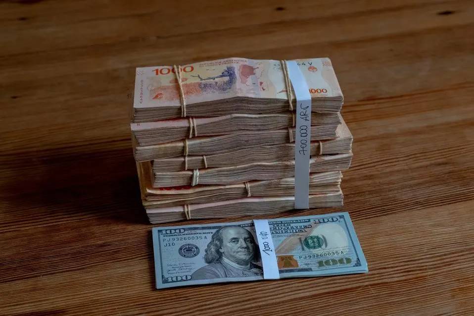 2023 年 9 月 26 日星期二,等值 1,000 美元的阿根廷比索纸币在阿根廷布宜诺斯艾利斯整理