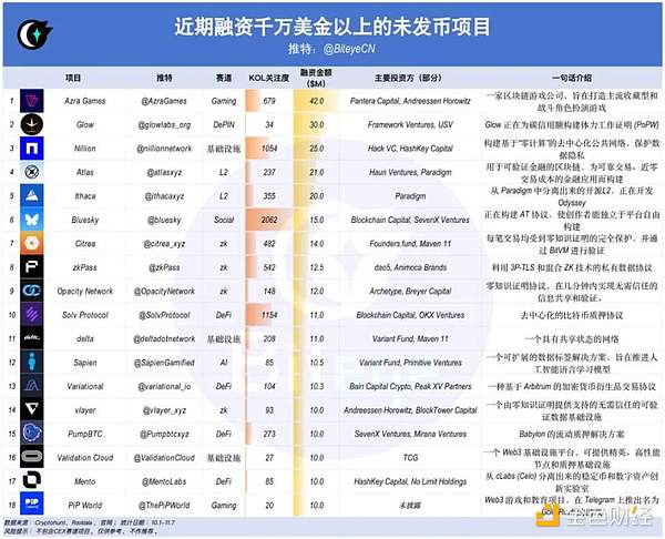 近期,多个未发币项目成功融资千万美金以上,涉及 AI、L2、zk、DeFi 等赛道。本文 Biteye 将为大家一一介绍这 18 个项目,包括 KOL 关注度、投资方、融资金额。
