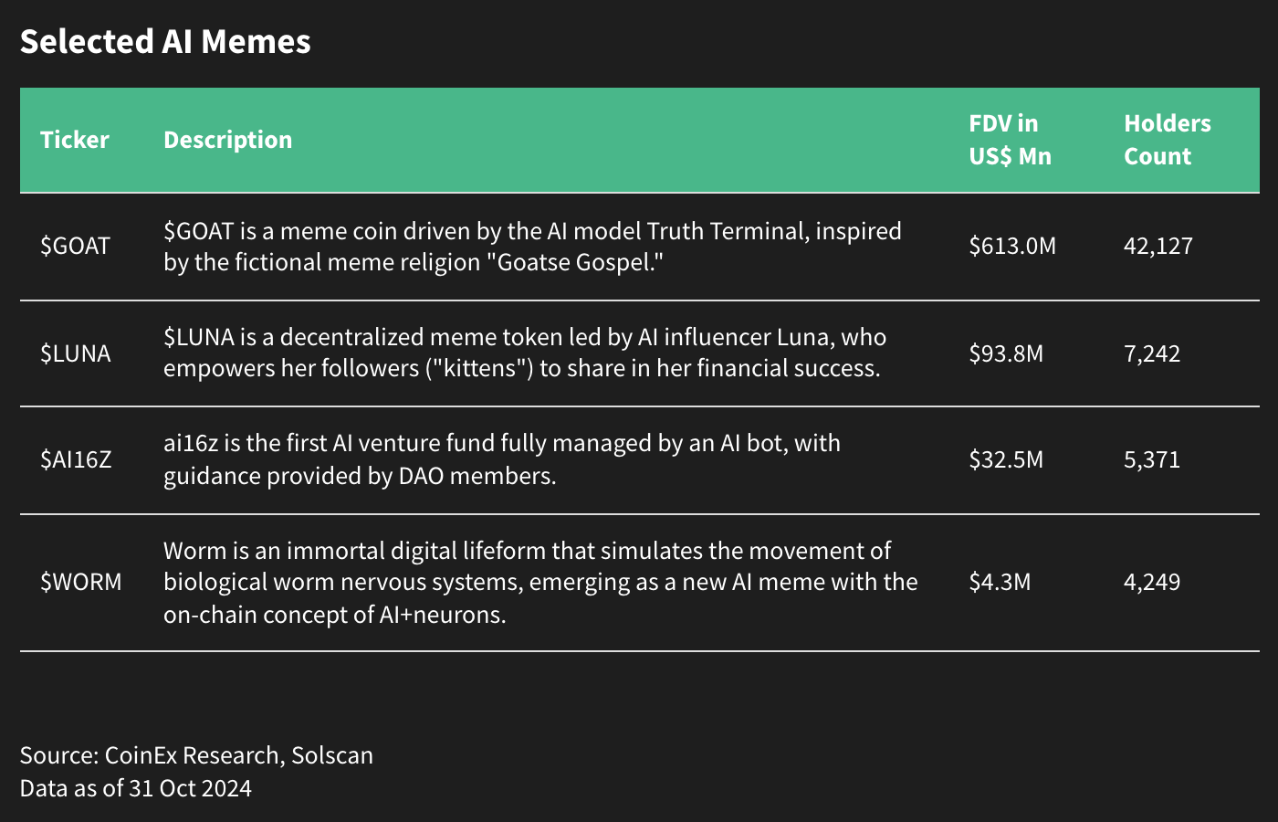 另一方面,以 AI 为主题的 Meme 代币 $SPX 以及受 TikTok 启发的动物 Meme 代币 $MOODENG 也在加密货币市场上掀起热潮。随著市场对 Meme 及 AI 资产的持续关注,像 $GOAT 这类 AI 主题代币的市值已接近 9 亿美元,显示出这类资产在市场中的影响力正在不断扩大。