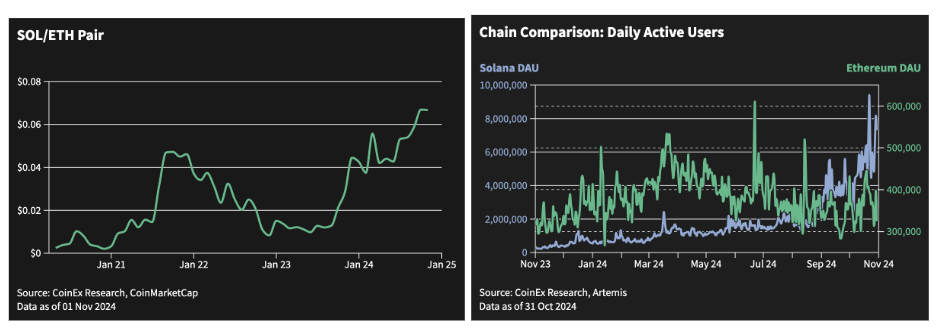 Solana 生态系统近期表现强劲,SOL/ETH 汇率创下历史新高。由于 Solana 去中心化交易所 (DEX) 活动显著增加,加上定期举办黑客松活动及友善的开发环境支持,使得 Solana 在部分指标上超越了以太坊,展现出其在 Layer 1 区块链环境中的竞争力。