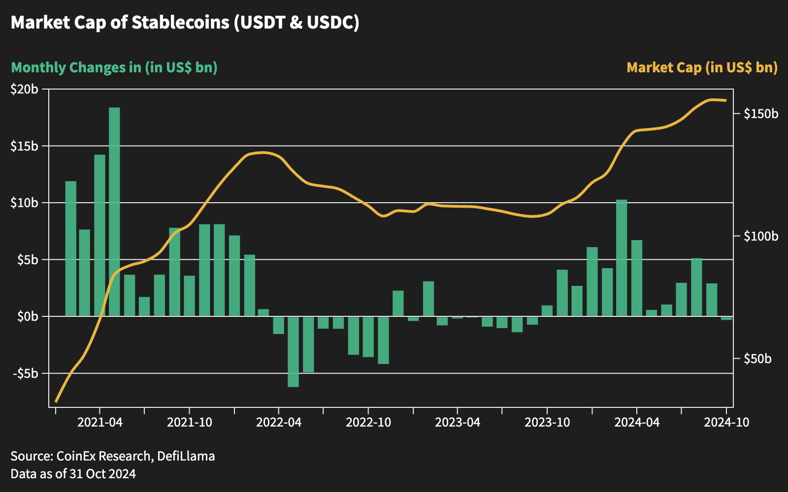 罕见的是,随著 11 月美国大选临近,投资者采取更为谨慎的态度,导致 10 月份稳定币出现小幅净流出,总额达 3.14 亿美元。尽管这与之前的熊市相比只是微不足道的数字,但这一资金外流显示出投资者为应对潜在的市场波动而进行避险,并暂时选择持有资本观望。