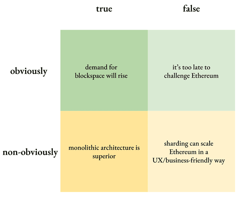 不显而易见的真相假设对 Solana 的发展起到了积极作用。它促使模块化与单体架构的讨论成为焦点,而这在以前并不常见。过去,大多数人都习惯用模块化的思维方式。Solana 还独具慧眼地认为分片技术是条死路。