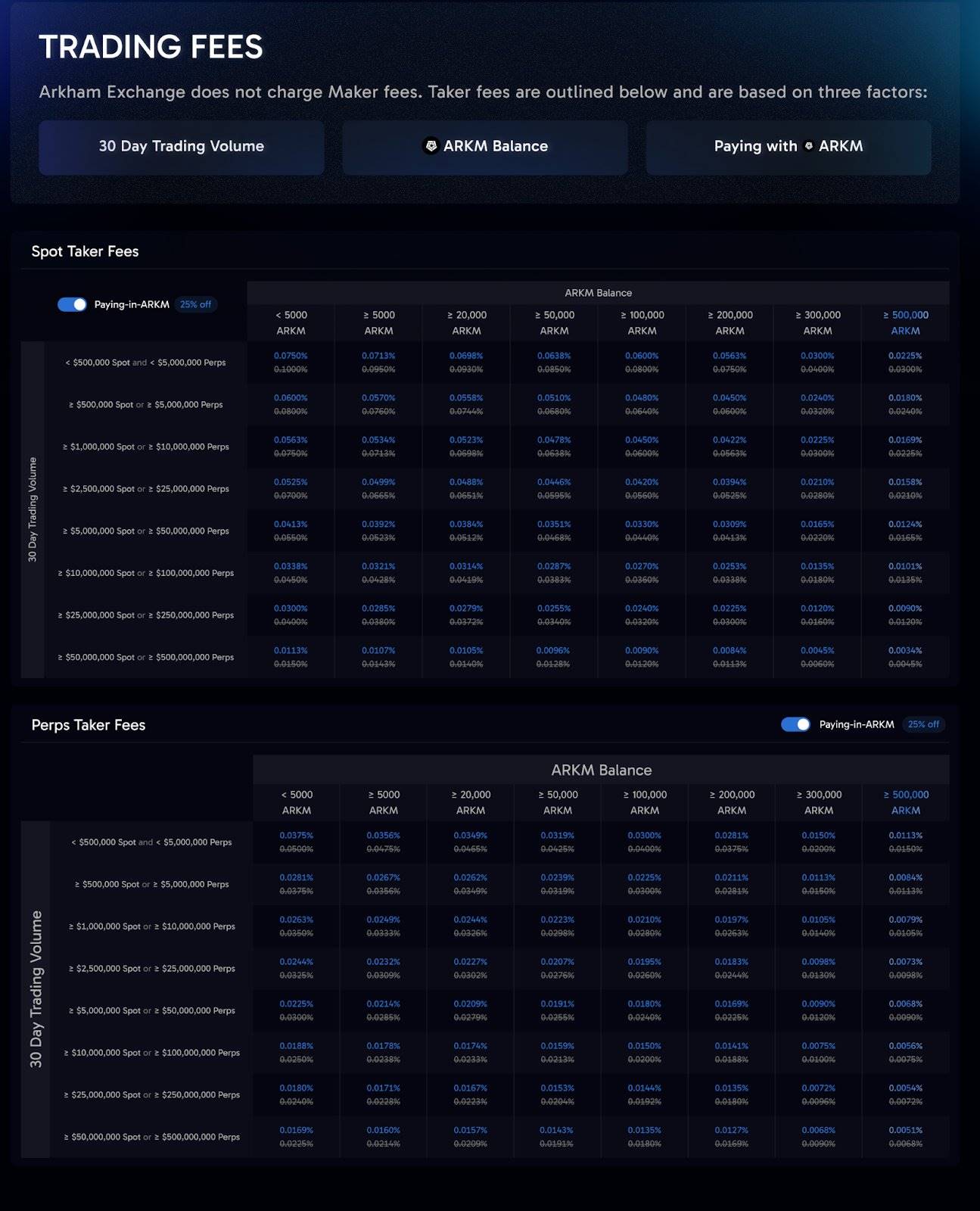 根据其官方推文显示,目前 Arkham 交易所对现货以及永续合约实行 0 挂单费用。根据用户的 ARKM 余额以及交易所内成交量,交易者能够享受到最高 95% 的手续费折扣。如果用户选择使用现余额中的 ARKM 支付,还可以再获得 25% 的费用折扣。