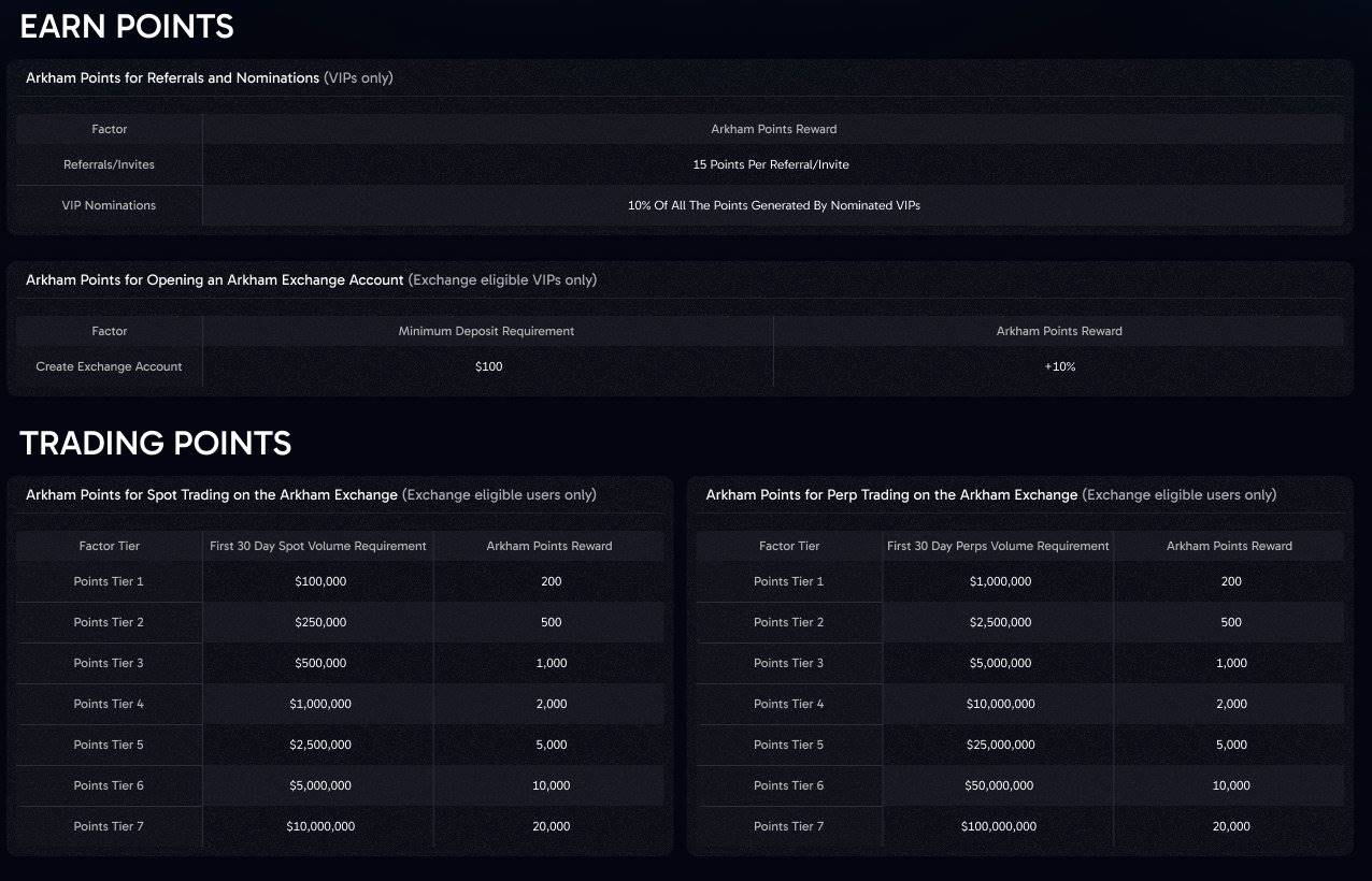 除开放注册之外,Arkham 为吸引新用户交易而公布了积分活动,用户可根据其在 Arkham 交易所的交易量来赚取积分。开设交易所账户的 VIP 还可获得 10% 的积分提升效果。