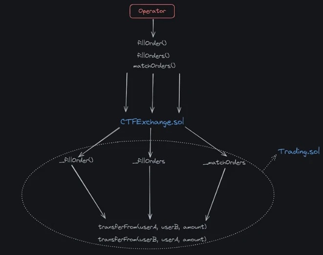 Auth.sol:角色管理器,定义验证函数和修饰符以设置角色,CTFExchange.sol 的 admin 和 operator;