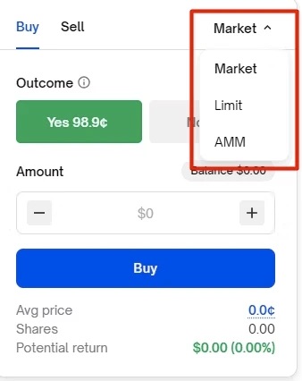 为了进行购买,Polymarket 界面提供三种类型的订单: