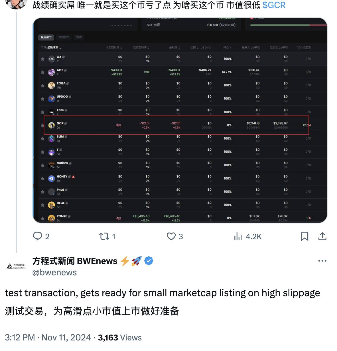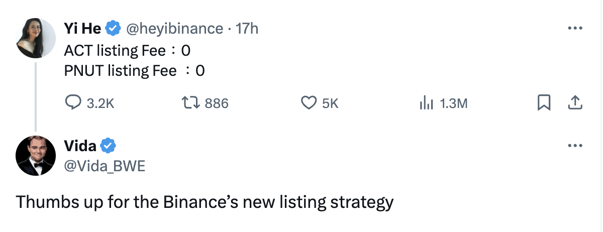 在这笔「新闻交易」大赚后,他还不忘在币安联合创始人何一回应 ACT 、PNUT 上币费为零的推文下为币安的上币策略竖起大拇指。