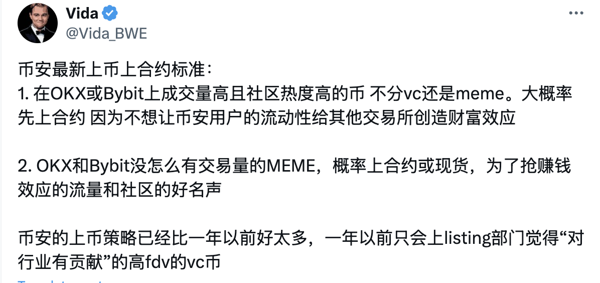 在 OKX 或 Bybit 上成交量高且社区热度高的币,不分 VC 还是 Meme。大概率先上合约,因为不想让币安用户的流动性给其他交易所创造财富效应。