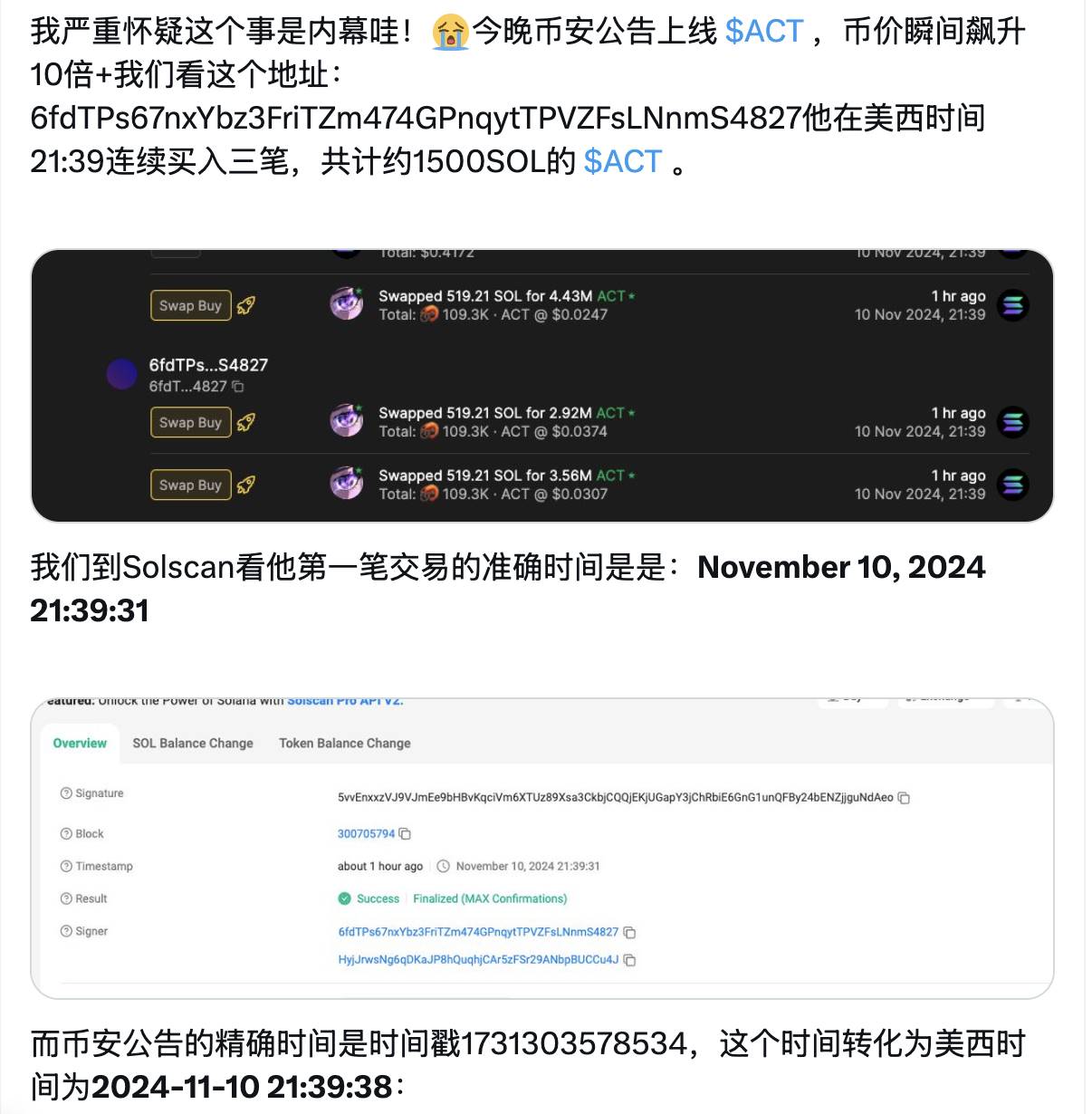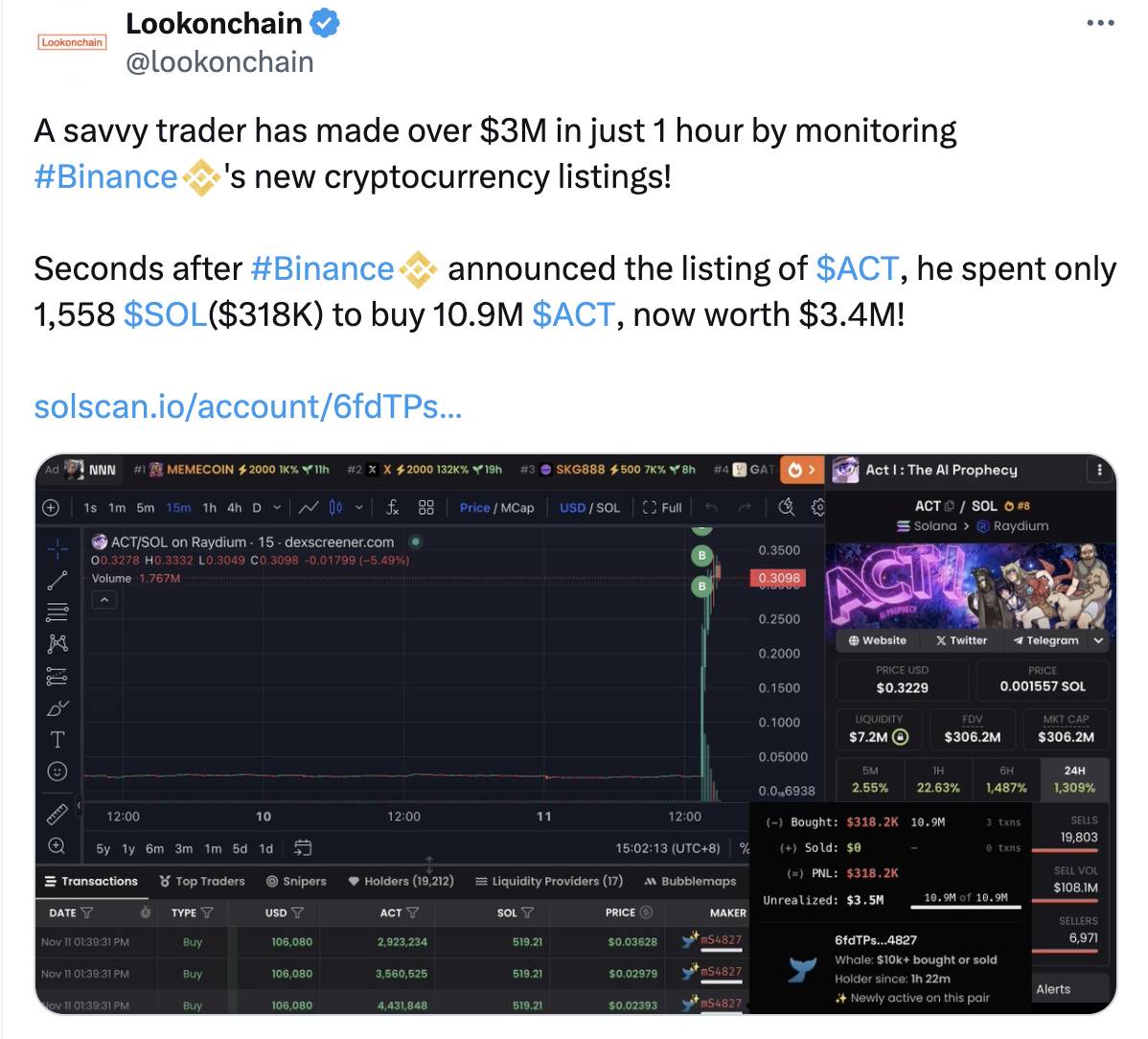 在 Binance 宣布上线 ACT 后的几秒内,他花费 1,558 SOL (约 32 万美元)购买了 1090 万个 ACT ,现价值 340 万美元,在 10 分钟内利润超 2000 万人民币!(截止 Lookonchain 发文时)