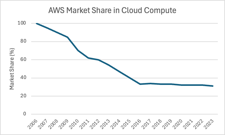 然而,结果是 AWS 的市场份额逐渐被其他云服务提供商蚕食,例如 Microsoft Azure 和 Google Cloud 每年都在稳步增长。最初接近 100% 的市场份额现在已经降至约 35%。