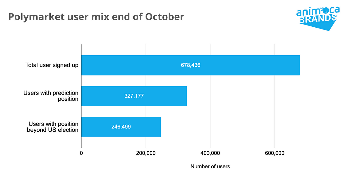 截至11月3日,总共有32.7万用户,其中一半的注册用户保持着活跃的仓位。在这些活跃用户中,大约8万名用户专注于与美国大选相关的市场,而剩下的24.7万用户则涉足其他市场类别。这表明,非选举市场的显著参与度反映了用户对平台的持续兴趣,即使选举周期结束后,这种兴趣也有可能支撑平台的持续增长和相关性。