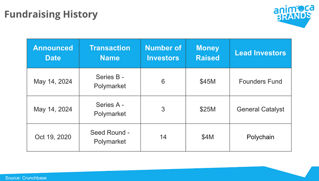 Polymarket的首次融资发生在2020年,公司成功筹集了400万美元。2024年5月,公司关闭了两轮融资,共吸引了九位投资者投资7000万美元。这笔资金预计将显著提升Polymarket的扩展能力,包括加强人才储备和市场覆盖。