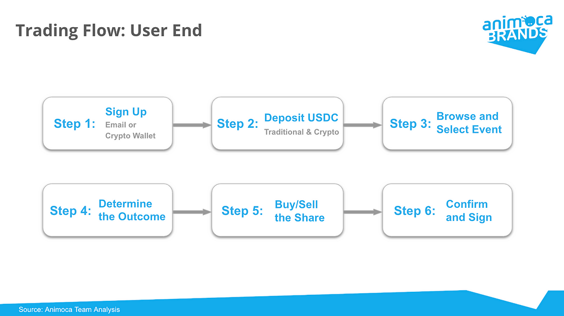 用户的旅程从通过电子邮件或加密钱包注册开始,接着将USDC从现有钱包转入平台,或者通过Moonpay直接用法币购买USDC。用户浏览可用市场并选择事件后,可以利用实时数据来指导他们的预测。下一步是根据这些洞察进行买卖,界面会显示潜在的回报。交易确认后,用户的账户地址将完成交易。若发生争议,用户还可以提出挑战来解决事件。